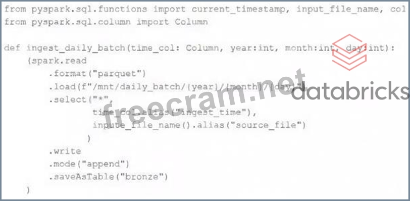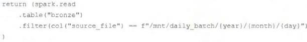 A nightly job ingests data into a Delta Lake table using the following code: The next step in the pipeline requires a function that returns an object that can be used to manipulate new records that have not yet been processed to the next table in the pipeline. Which code snippet completes this function definition?