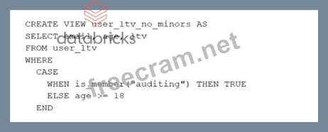 A table named user_ltv is being used to create a view that will be used by data analysts on various teams. Users in the workspace are configured into groups, which are used for setting up data access using ACLs. The user_ltv table has the following schema: email STRING, age INT, ltv INT The following view definition is executed: An analyst who is not a member of the auditing group executes the following query: SELECT * FROM user_ltv_no_minors Which statement describes the results returned by this query?
