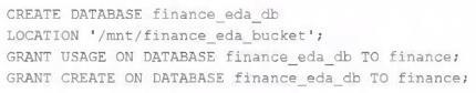 An external object storage container has been mounted to the location /mnt/finance_eda_bucket. The following logic was executed to create a database for the finance team: After the database was successfully created and permissions configured, a member of the finance team runs the following code: If all users on the finance team are members of the finance group, which statement describes how the tx_sales table will be created?