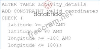 The failure is that the code to add CHECK constraints to the Delta Lake table fails when executed. The code uses ALTER TABLE ADD CONSTRAINT commands to add two CHECK constraints to a table named activity_details. The first constraint checks if the latitude value is between -90 and 90, and the second constraint checks if the longitude value is between -180 and 180. The cause of this failure is that the activity_details table already contains records that violate these constraints, meaning that they have invalid latitude or longitude values outside of these ranges. When adding CHECK constraints to an existing table, Delta Lake verifies that all existing data satisfies the constraints before adding them to the table. If any record violates the constraints, Delta Lake throws an exception and aborts the operation. Verified References: [Databricks Certified Data Engineer Professional], under "Delta Lake" section; Databricks Documentation, under "Add a CHECK constraint to an existing table" section. https://docs.databricks.com/en/sql/language-manual/sql-ref-syntax-ddl-alter-table.html#add-constraint