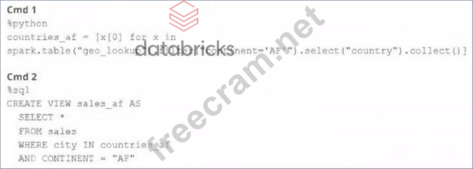 This is the correct answer because Cmd 1 is written in Python and uses a list comprehension to extract the country names from the geo_lookup table and store them in a Python variable named countries af. This variable will contain a list of strings, not a PySpark DataFrame or a SQL view. Cmd 2 is written in SQL and tries to create a view named sales af by selecting from the sales table where city is in countries af. However, this command will fail because countries af is not a valid SQL entity and cannot be used in a SQL query. To fix this, a better approach would be to use spark.sql() to execute a SQL query in Python and pass the countries af variable as a parameter. Verified Reference: [Databricks Certified Data Engineer Professional], under "Language Interoperability" section; Databricks Documentation, under "Mix languages" section.