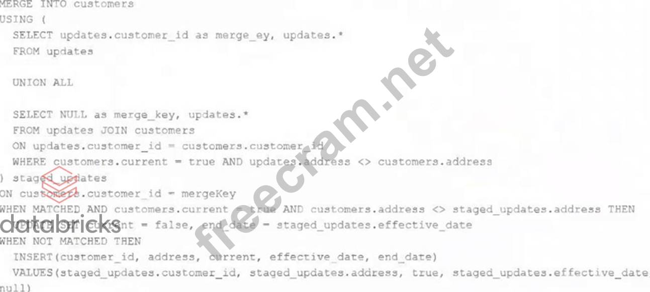 The logic uses the MERGE INTO command to merge new records from the view updates into the table customers. The MERGE INTO command takes two arguments: a target table and a source table or view. The command also specifies a condition to match records between the target and the source, and a set of actions to perform when there is a match or not. In this case, the condition is to match records by customer_id, which is the primary key of the customers table. The actions are to update the existing record in the target with the new values from the source, and set the current_flag to false to indicate that the record is no longer current; and to insert a new record in the target with the new values from the source, and set the current_flag to true to indicate that the record is current. This means that old values are maintained but marked as no longer current and new values are inserted, which is the definition of a Type 2 table. Verified Reference: [Databricks Certified Data Engineer Professional], under "Delta Lake" section; Databricks Documentation, under "Merge Into (Delta Lake on Databricks)" section.
