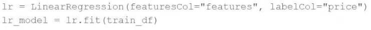 A machine learning engineer would like to develop a linear regression model with Spark ML to predict the price of a hotel room. They are using the Spark DataFrame train_df to train the model. The Spark DataFrame train_df has the following schema: The machine learning engineer shares the following code block: Which of the following changes does the machine learning engineer need to make to complete the task?