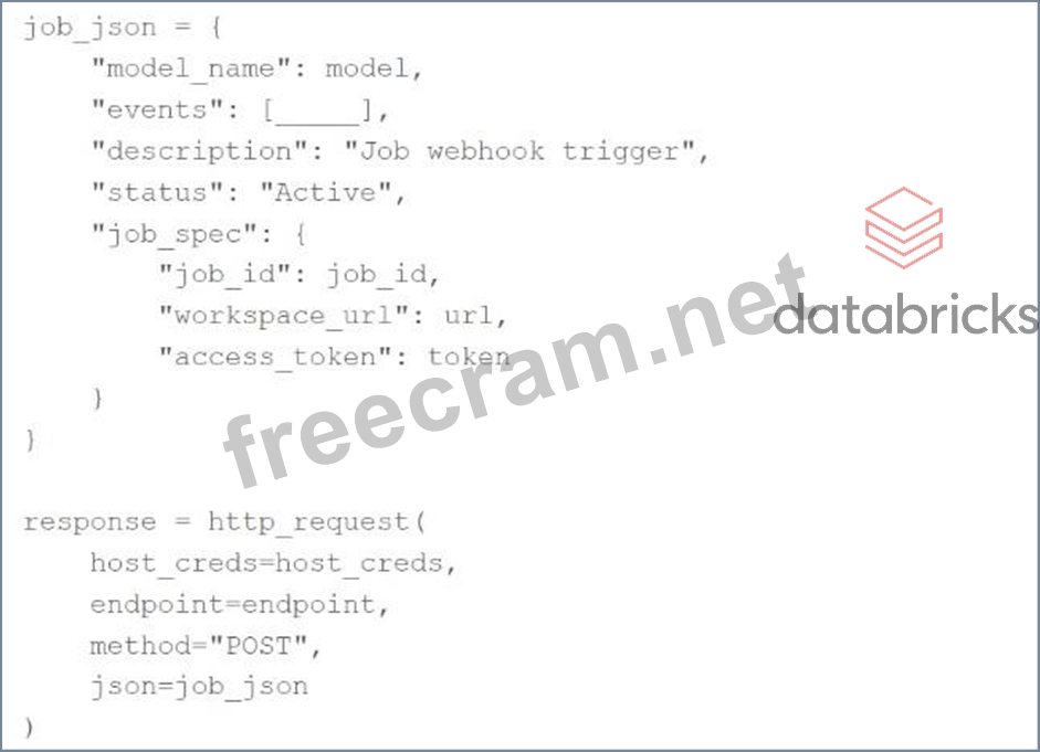A machine learning engineer is attempting to create a webhook that will trigger a Databricks Job job_id when a model version for model model transitions into any MLflow Model Registry stage. They have the following incomplete code block: Which of the following lines of code can be used to fill in the blank so that the code block accomplishes the task?