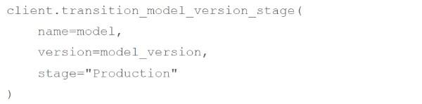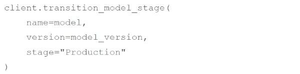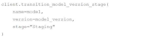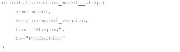 A machine learning engineer wants to move their model version model_version for the MLflow Model Registry model model from the Staging stage to the Production stage using MLflow Client client. Which of the following code blocks can they use to accomplish the task?