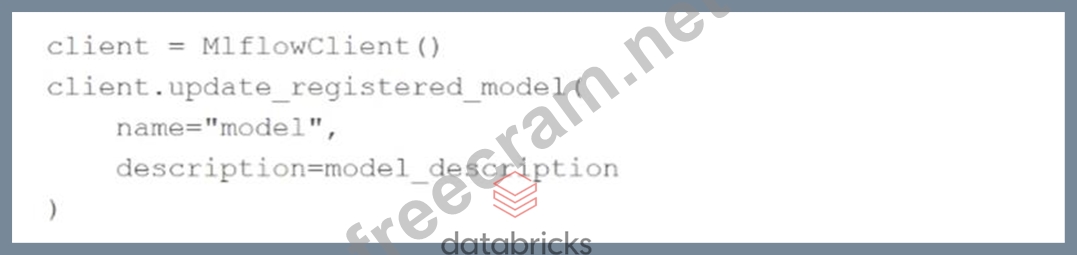 A machine learning engineering manager has asked all of the engineers on their team to add text descriptions to each of the model projects in the MLflow Model Registry. They are starting with the model project "model" and they'd like to add the text in the model_description variable. The team is using the following line of code: Which of the following changes does the team need to make to the above code block to accomplish the task?