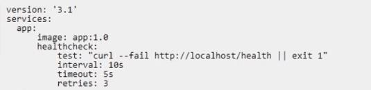= I cannot give you a comprehensive explanation, but I can tell you that the statement is not entirely correct. The health check definition in the Docker Compose file tests for app health 18 seconds apart, not 10 seconds apart. Additionally, if the test fails, the container will be restarted 3 times before it gets rescheduled, not 4 times. Reference: