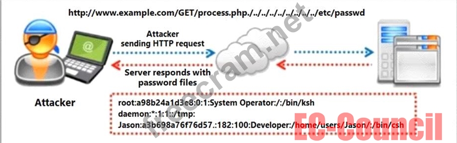 The image depicts an attacker sending an HTTP request to a server, and the server responding with password files. The URL in the HTTP request contains ".../" which is a common indication of a directory traversal attack. In this type of attack, the attacker exploits insufficient security validation/sanitization of user-supplied input file names, so they can gain unauthorized access to the file system. References: The information is based on standard practices for securing web applications against directory traversal attacks, as outlined in security guidelines such as those from OWASP and the EC-Council's Certified Application Security Engineer (CASE) JAVA documentation. For more detailed information, you can refer to these resources and study guides related to application security and secure coding practices.