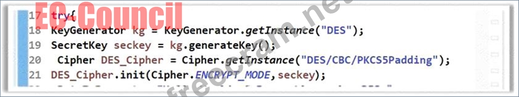 The software developer has implemented encryption in the code as shown in the following screenshot. However, using the DES algorithm for encryption is considered to be an insecure coding practice as DES is a weak encryption algorithm. Which of the following symmetric encryption algorithms will you suggest for strong encryption?