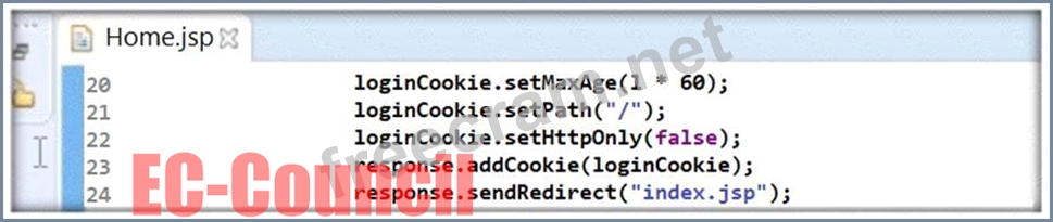 The setHttpOnly(false) method call in the code indicates that the HttpOnly flag is not set for the cookie. This is a security concern because when the HttpOnly flag is not set, it allows client-side scripts, such as JavaScript, to access the cookie. Attackers can exploit this vulnerability by using cross-site scripting (XSS) attacks to steal the cookie and potentially hijack the user's session. To mitigate this vulnerability, the HttpOnly flag should be set to true, which instructs the browser to prevent client-side scripts from accessing the cookie. The correct code should be: Java loginCookie.setHttpOnly(true); AI-generated code. Review and use carefully. More info on FAQ. This change ensures that the cookie is protected from being accessed by client-side scripts. References: For verified answers and comprehensive explanations, it is recommended to refer to the official EC-Council Application Security Engineer (CASE) JAVA study guides and course materials. These resources provide detailed information on secure coding practices, including the proper use of the HttpOnly flag in cookies to prevent client-side script attacks. Additionally, the EC-Council's training programs offer in-depth knowledge and hands-on experience in secure coding techniques for Java applications.