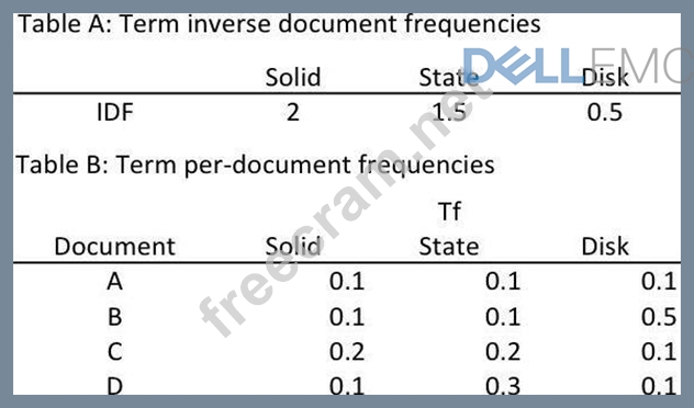 In the Exhibit, Table A provides the inverse document frequency for each term across the corpus. Table B provides each term's frequency in four documents selected from corpus.