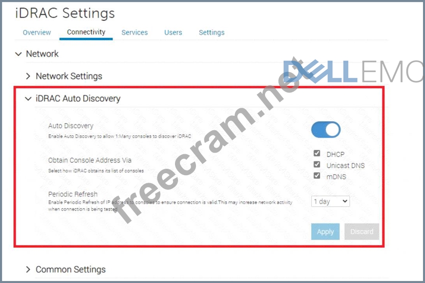The iDRAC (Integrated Dell Remote Access Controller) setting displayed in the exhibit is associated with the Server Initiated Discovery feature in OpenManage Enterprise. This feature allows servers to initiate their discovery into OpenManage Enterprise using the iDRAC Auto Discovery settings. Here's how it works: * iDRAC Auto Discovery: This setting, when enabled on the server's iDRAC, allows the server to present itself to OpenManage Enterprise for discovery and management. * Server Initiated Discovery: In OpenManage Enterprise, this feature is used to automatically discover servers that have iDRAC Auto Discovery enabled. It simplifies the process of adding new servers to the management console. * Network Configuration: The network settings in iDRAC, such as obtaining an IP address via DHCP, mDNS, or Unicast DNS, are configured to ensure that the server can communicate with OpenManage Enterprise. * Periodic Refresh: The periodic refresh setting ensures that the server's presence is consistently updated in OpenManage Enterprise, maintaining accurate and current device management. By using Server Initiated Discovery, administrators can automate the process of integrating servers with OpenManage Enterprise, reducing the need for manual discovery jobs and streamlining the management of server infrastructure. For more detailed information on Server Initiated Discovery and its configuration, administrators can refer to the official Dell OpenManage documentation and support resources.