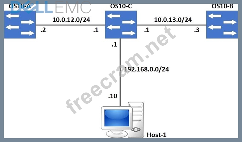 A default route exists on OS10-C that points all Internet traffic towards 10.0.13.3 on OS10-B. A network administrator must re-route Internet traffic that is only sourced from Host-1 to 10.0.12.2 on OS10-A instead.