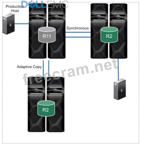 Step by Step Comprehensive Detailed Explanation: The topology shown in the exhibit depictsCascaded SRDF. This SRDF configuration involves three storage arrays (or sites) connected in a chained or cascaded manner. Here's how it works: * Primary Site (R1):The production host is connected to the primary storage array (R1). * Intermediate Site (R2):The primary array (R1) synchronously replicates data to an intermediate array (R2). * Remote Site (R2):The intermediate array (R2) then asynchronously replicates data to a remote array (also labeled R2 in the diagram). This cascading setup provides a multi-hop disaster recovery solution, where data is first replicated synchronously to a nearby site for high availability and then asynchronously replicated to a further remote site for disaster recovery. Why other options are incorrect: * B. SRDF/Star:SRDF/Star involves a central array replicating to multiple remote arrays in a star-like pattern. * C. SRDF/Metro:SRDF/Metro is designed for synchronous replication over short distances, typically within a metropolitan area. * D. Concurrent SRDF:Concurrent SRDF allows multiple SRDF relationships to exist simultaneously for the same device. References and documents of Dell's public documentation for PowerMax Operate v.2: * Dell Solutions Enabler 10.0.0 SRDF Family CLI User Guide:This guide provides detailed information about different SRDF configurations, including Cascaded SRDF. You can find this document on the Dell Support website by searching for "Solutions Enabler SRDF Family CLI User Guide." * Dell PowerMax Family: Essentials and Best Practices Guide:This guide offers a comprehensive overview of SRDF and its functionalities, including various topologies and use cases.
