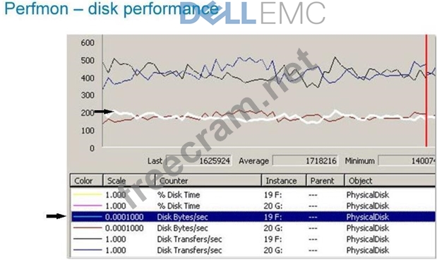 The transfer rate for disk 19F shown in the exhibit is 2 MB/s. The exhibit indicates that the scale for "Disk Bytes/sec" is set to 0.00010000. Given this scale, the displayed value of approximately 200 (in the highlighted blue line) corresponds to 200 x 0.00010000 MB/s, which equals 2 MB/s. References: * Analysis of the exhibit data and the scale provided. * General understanding of performance monitoring metrics and their interpretations.