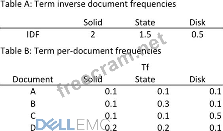 An analyst is searching a corpus of documents for the topic "solid state disk". As shown in the graphic, Table A provides the inverse document frequency for each term across the corpus. Table B provides each term's frequency in four documents selected from the corpus.