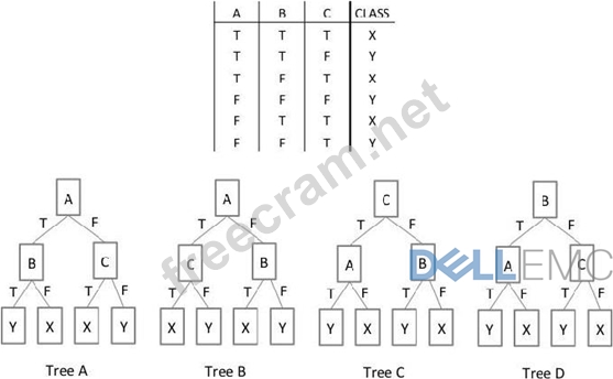 In the Exhibit, the table shows the values for the input Boolean attributes "A", "B", and "C". It also shows the values for the output attribute "class". Which decision tree is valid for the data?