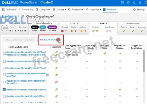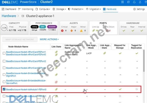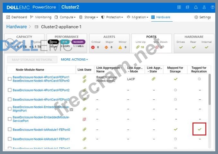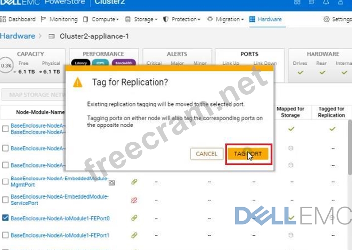 Use the PowerStore Manager simulator to configure the BaseEnclosure-NodeA-IoModule1-FEport0 as a replication port. When you have finished using the simulator, Click Next.