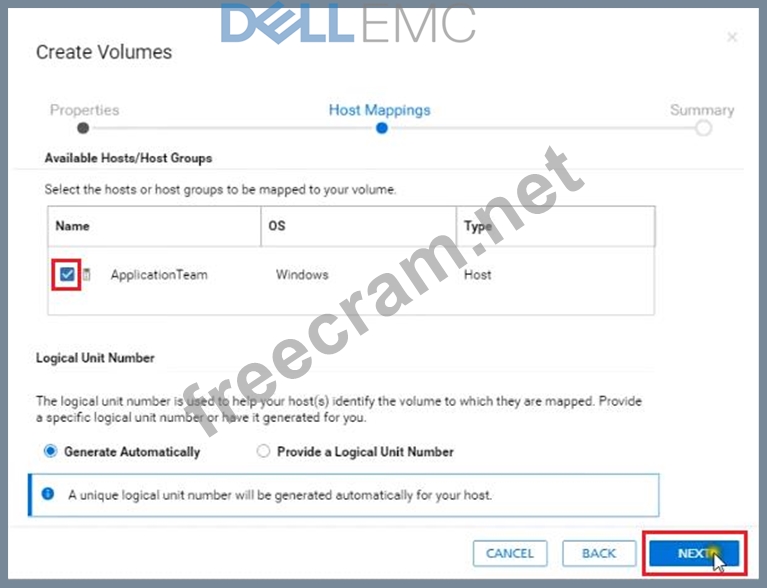 An administrator received a request to provision a new volume. Use the simulator to provision a volume of 50 GB with a performance policy of high for their host named "ApplicationTeam". When you have finished using the simulator, click Next.