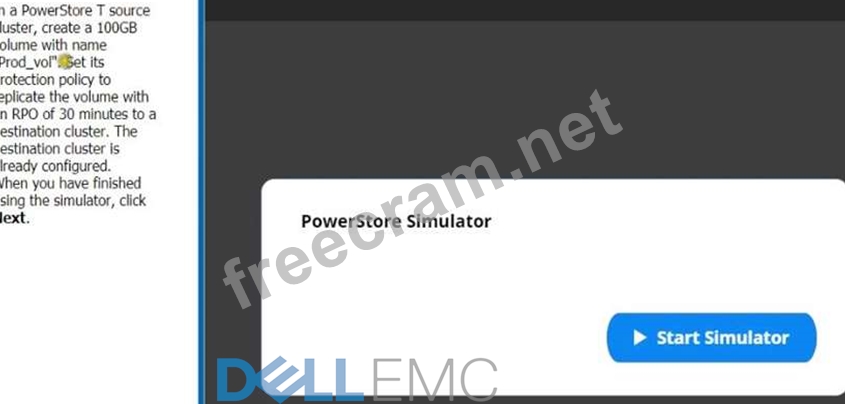 In a PowerStore T source cluster, create a 100GB volume with name "Prod_vol" and set a protection policy to replicate the volume with RPO 30 minutes to a destination cluster. The destination cluster is already configured. When you have finished using the simulator, click Next.