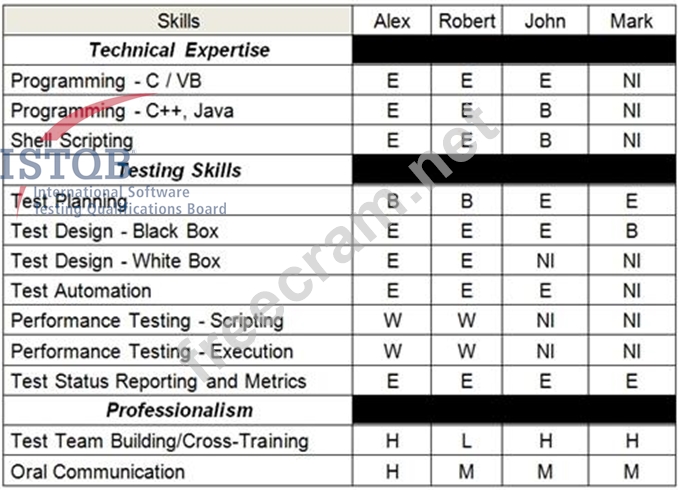Consider the following skills assessment spreadsheet for your test team (consisting of four team members):