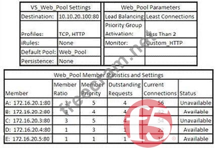 A virtual server is defined per the charts. The last five client connections were to members C, D, A, B, B . Given the conditions shown in the above graphic, if a client with IP address 205.12.45.52 opens a connection to the virtual server, which member will be used for the connection.