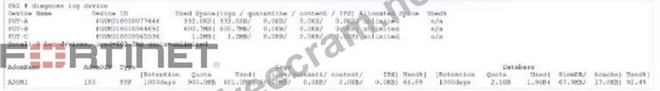 The exhibit displays a diagnose log device output on a FortiAnalyzer, showing details about disk space usage and quotas for different FortiGate devices and ADOMs (Administrative Domains). Here's a breakdown of key details: