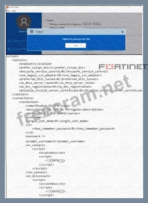 An administrator has restored the modified XML configuration file to FortiClient and sees the error shown in the exhibit.