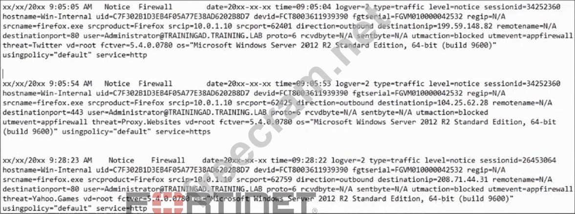Based on the FortiClient logs shown in the exhibit: The first log entry shows the application "firefox.exe" trying to access a destination IP, with the threat identified as "Twitter." The action taken by the application firewall is "blocked" with the event type "appfirewall." This indicates that the application firewall has blocked access to Twitter. Reference FortiClient EMS 7.2 Study Guide, Application Firewall Logs Section Fortinet Documentation on Interpreting FortiClient Logs