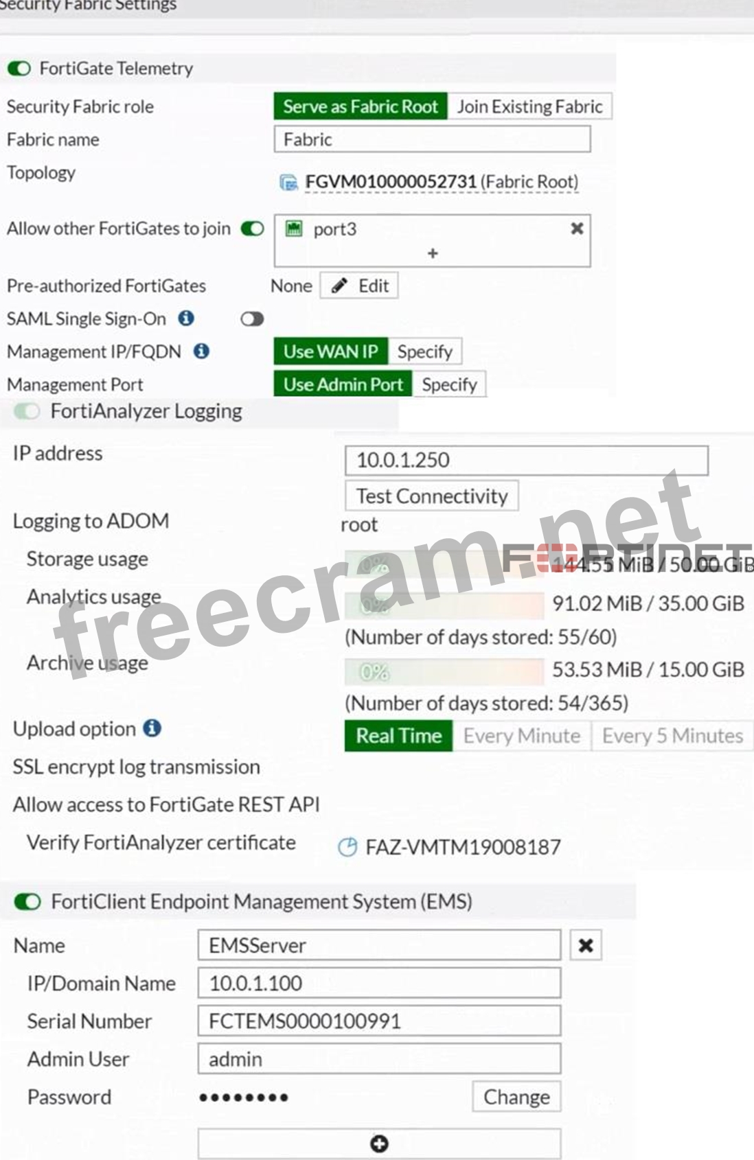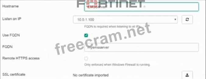 Based on the FortiGate Security Fabric settings shown in the exhibits, to successfully quarantine an endpoint when it is detected as a compromised host (IOC), the following step is required: Enable Remote HTTPS Access to EMS: This setting allows FortiGate to communicate securely with FortiClient EMS over HTTPS. Remote HTTPS access is essential for the quarantine functionality to operate correctly, enabling the EMS server to receive and act upon the quarantine commands from FortiGate. Therefore, the administrator must enable remote HTTPS access to EMS to allow the quarantine process to function properly. Reference FortiGate Infrastructure 7.2 Study Guide, Security Fabric and Integration with EMS Sections Fortinet Documentation on Enabling Remote HTTPS Access to FortiClient EMS