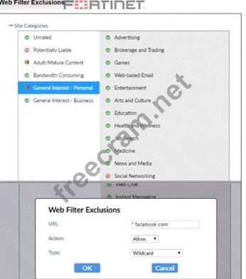 * Observation of Web Filter Exclusions: * The exhibit shows a web filter exclusion for "*.facebook.com" with the action set to "Allow." * Evaluating Actions: * This configuration means that FortiClient will allow access to Facebook and its subdomains. * Conclusion: * When users try to access "www.facebook.com," FortiClient will allow the access based on the web filter exclusion settings. References: * FortiClient web filter configuration and exclusion documentation from the study guides.