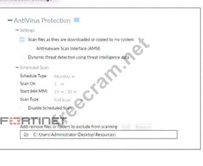 Based on the settings shown in the exhibit, FortiClient is configured to scan files as they are downloaded or copied to the system. This means that if a user copies files to the "Resources" folder, which is not listed under exclusions, FortiClient will scan these files for infections. The exclusion path mentioned in the settings, "C: \Users\Administrator\Desktop\Resources", indicates that any files copied to this specific folder will not be scanned, but since the question implies that the "Resources" folder is not the same as the excluded path, FortiClient will indeed scan the files for infections.