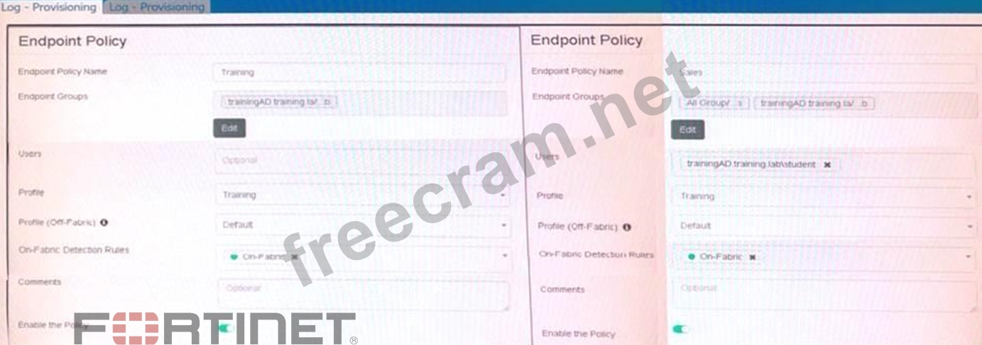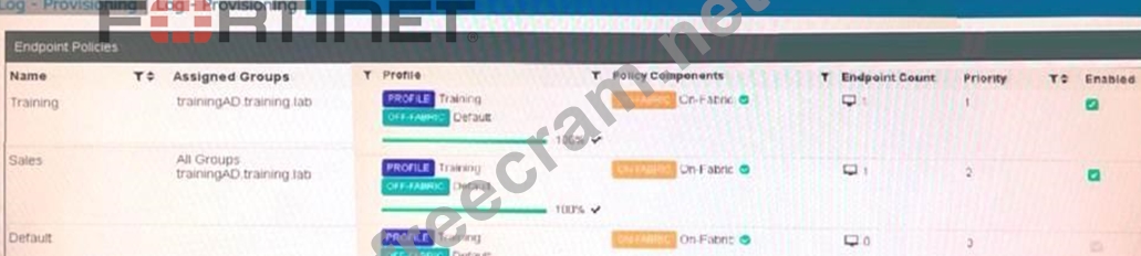 Based on the configuration shown in the exhibits: There are three endpoint policies configured: Training, Sales, and Default. The "Training" policy is assigned to the "trainingAD.training.lab" group. The "Sales" policy is assigned to "All Groups" and "trainingAD.training.lab/student." The "Default" policy has no specific groups assigned. When someone logs in with the user account "student" on an endpoint in the "trainingAD" domain: The "Training" policy is specifically assigned to the "trainingAD.training.lab" group. The "Sales" policy includes "trainingAD.training.lab/student" but not the general "trainingAD.training.lab" group. The system will prioritize the most specific match for the group. Therefore, FortiClient EMS will assign the "Training" policy to the "student" account logging into the "trainingAD" domain as it matches the group "trainingAD.training.lab" directly.