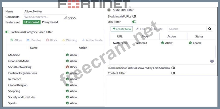 Refer to exhibit. An administrator configured the web filtering profile shown in the exhibit to block access to all social networking sites except Twitter. However, when users try to access twitter.com, they are redirected to a FortiGuard web filtering block page. Based on the exhibit, which configuration change can the administrator make to allow Twitter while blocking all other social networking sites?