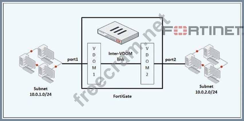 The two static routes required in the FortiGate configuration to route traffic between both subnets through an inter-VDOM link are: B. A static route in VDOM2 for the destination subnet 10.0.1.0/24 C. A static route in VDOM1 for the destination subnet 10.0.2.0/24 In VDOM1, a static route for the destination subnet 10.0.2.0/24 is needed to route traffic destined for VDOM2's subnet through the inter-VDOM link. In VDOM2, a static route for the destination subnet 10.0.1.0/24 is needed to route traffic destined for VDOM1's subnet through the inter-VDOM link.