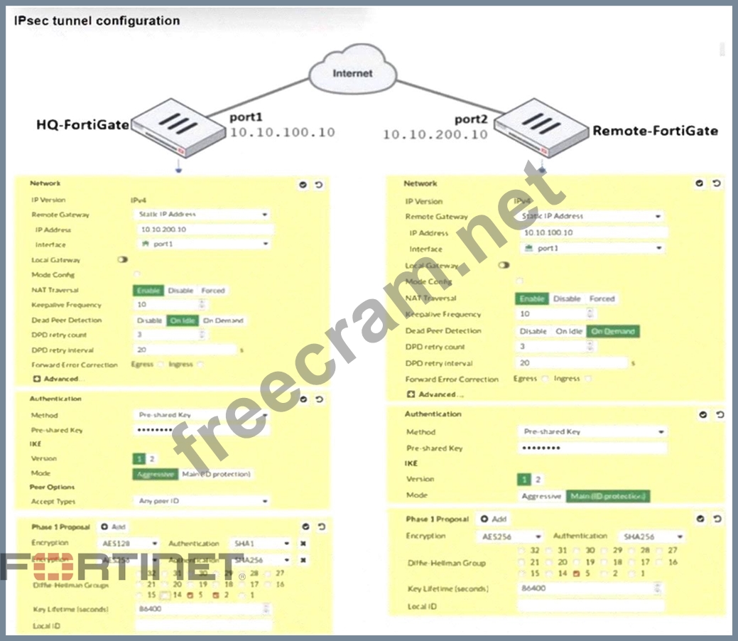Based on the phase 1 configuration and the diagram shown in the exhibit, which two configuration changes can the administrator make to bring phase 1 up? (Choose two.)