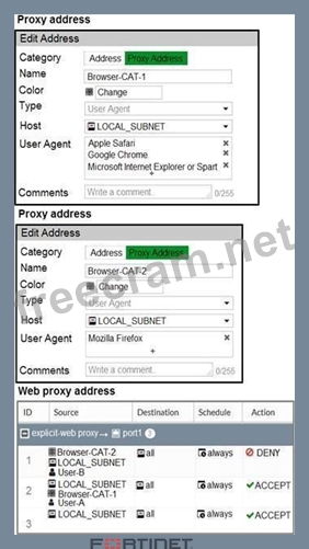 - Browser CAT2 & Local subnet & User B --> deny - Browser CAT1 & Local subnet & User all --> accept Above exhibits only users from Chrome and IE are allowed. Chrome and IE use the same system proxy setting. Proxy rule is accept for all users with these two browsers. C: hit the 3rd rule.