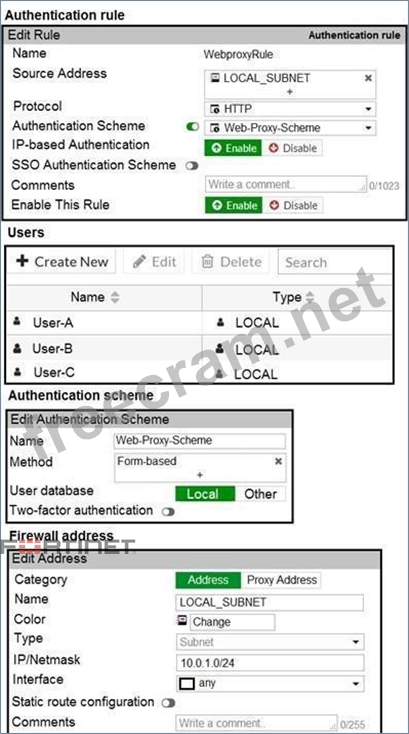 Refer to the exhibit. The exhibit shows proxy policies and proxy addresses, the authentication rule and authentication scheme, users, and firewall address. An explicit web proxy is configured for subnet range 10.0.1.0/24 with three explicit web proxy policies. The authentication rule is configured to authenticate HTTP requests for subnet range 10.0.1.0/24 with a form-based authentication scheme for the FortiGate local user database. Users will be prompted for authentication. How will FortiGate process the traffic when the HTTP request comes from a machine with the source IP 10.0.1.10 to the destination http:// www.fortinet.com? (Choose three.)