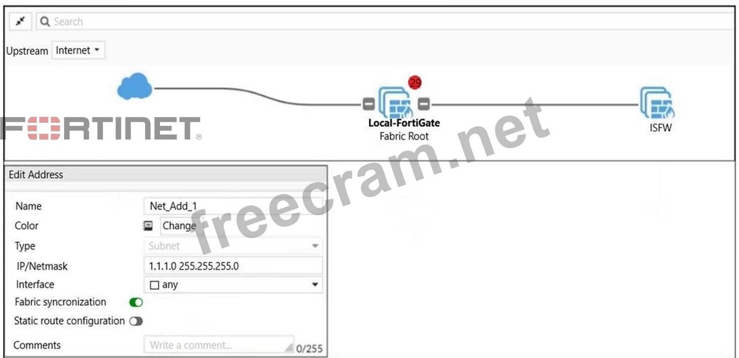 An administrator creates a new address object on the root FortiGate (Local-FortiGate) in the security fabric. After synchronization, this object is not available on the downstream FortiGate (ISFW).
