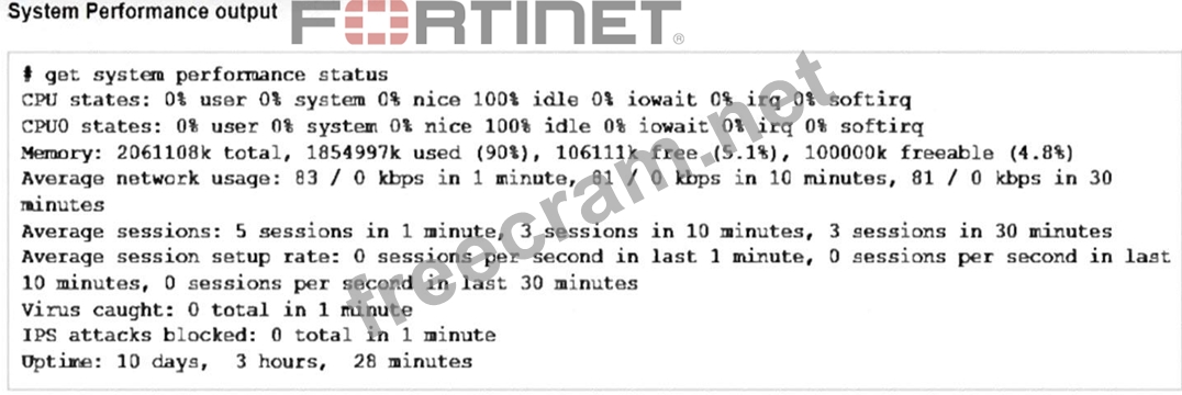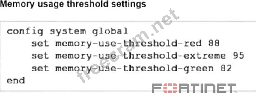 Refer to the exhibits, which show the system performance output and the default configuration of high memory usage thresholds in a FortiGate.
