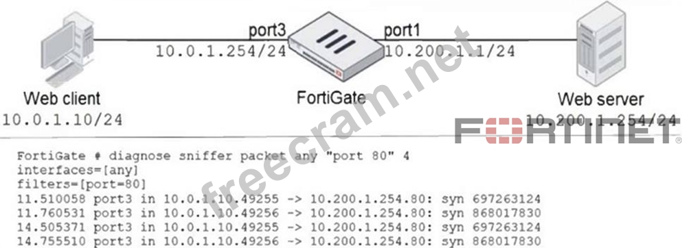 In the network shown in the exhibit, the web client cannot connect to the HTTP web server. The administrator runs the FortiGate built-in sniffer and gets the output shown in the exhibit.