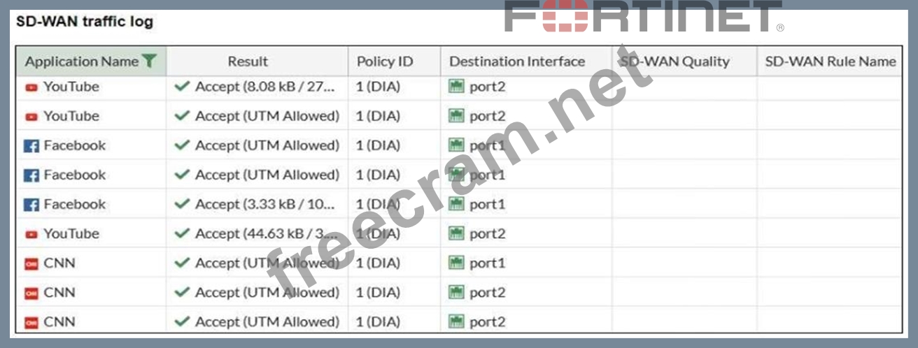 If the SD-WAN traffic logs do not show the specific SD-WAN rule name, it likely means that FortiGate is using the default or implicit SD-WAN rule to balance traffic. The implicit rule comes into effect when no explicit SD-WAN rule is matched, and as a result, the SD-WAN rule name is not displayed in the logs. The default behavior is to load balance the traffic across available interfaces based on SD-WAN strategy.