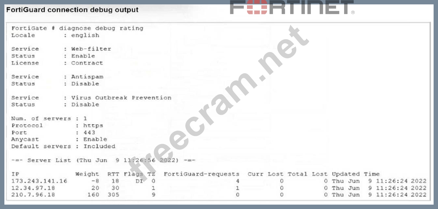 The debug output indicates that FortiGate connected to one server (173.243.141.16) to retrieve contract information as it shows four FortiGuard requests without any packet loss, which confirms the connection to the server. Additionally, the default FortiGuard communication settings are being used, as indicated by the use of the HTTPS protocol on port 443, which is the default setting for FortiGuard connections. Reference: FortiOS 7.4.1 Administration Guide: FortiGuard Connection Settings