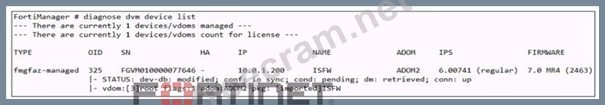 The output indicates that: * The device's status is shown as "dev-db: modified" and "conf: in sync," which means that there is a difference between the device-level database on FortiManager and the actual running configuration of the managed FortiGate. Therefore, the latest revision history for the managed FortiGate does not match the device-level database, which confirms statement A as true. * "dm: retrieved" status indicates that configuration changes have been installed on the FortiGate, confirming statement B as true. It also means that the configuration has been modified, and those changes have been pulled from the FortiGate to the FortiManager. Statements C and D are incorrect because: * C is incorrect as it implies an automatic update, whereas "dev-db: modified" indicates changes have been made on the FortiGate device that are not yet reflected in the FortiManager's database. * D is incorrect because "dev-db: modified" shows that the device-level database and running configuration are not in sync. FortiManager References: * Refer to the FortiManager 7.4 Administrator Guide: Device Manager > Device Status to understand the "dev-db" and "conf" status meanings.
