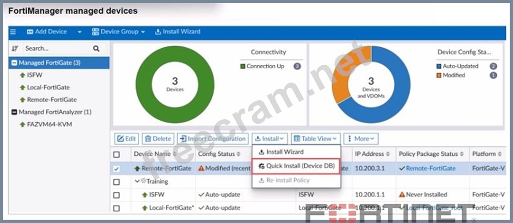 * Option B: It provides the option to preview only the policy package changes before installing them.This is correct. The Quick Install option in FortiManager provides a preview of policy changes before they are applied, allowing administrators to review and confirm the changes. * Option D: It installs device-level changes on the FortiGate device without launching the Install Wizard.This is correct. Quick Install allows for the immediate installation of device-level changes, such as interface or routing configurations, directly onto the FortiGate without going through the full Install Wizard. Explanation of Incorrect Options: * Option A: It installs provisioning template changes on the FortiGate deviceis incorrect because Quick Install does not specifically deal with provisioning templates. * Option C: It installs all the changes in the device database first and the administrator must reinstall the changes on the FortiGate deviceis incorrect because Quick Install directly applies changes to the FortiGate device, not requiring a separate reinstall step. FortiManager References: * Refer to "FortiManager Administration Guide" for details on "Quick Install" functionality under "Device Management."