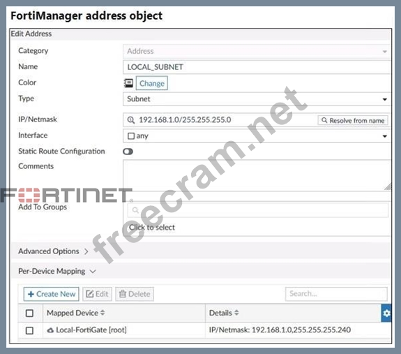 Refer to the exhibit. An administrator has created a firewall address object that is used in multiple policy packages for multiple FortiGate devices in an ADOM. After the installation operation is performed, which IP/netmask is shown on FortiManager for this firewall address object for devices without a Per-Device Mapping set?