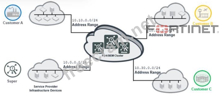 The service provider deployed FortiSIEM without a collector and added three customers on the supervisor.
