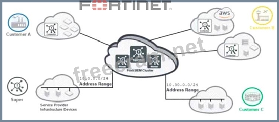 The exhibit shows a FortiSIEM cluster deployed in a multi-tenant service provider environment, serving multiple customers. The architecture includes: 1. Customers with Collectors Customer A and Customer B (AWS) have collectors deployed within their environments. Collectors gather and forward logs to the FortiSIEM cluster for centralized analysis. 2. Customers Without Collectors Customer C does not have a collector; instead, it sends logs directly to the FortiSIEM cluster. 3. Super Organization Managing Infrastructure The service provider infrastructure devices (e.g., networking and security appliances) are managed directly by the FortiSIEM cluster. This mixed setup, where some customers use collectors while others send logs directly, represents a hybrid deployment with and without collectors.
