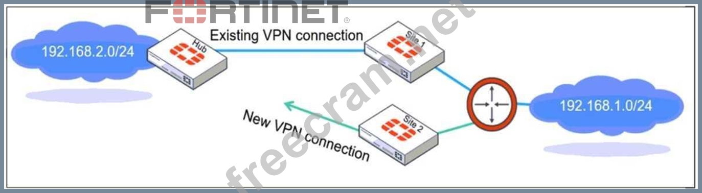 Refer to the exhibit, which shows a network diagram showing the addition of site 2 with an overlapping network segment to the existing VPN IPsec connection between the hub and site 1.