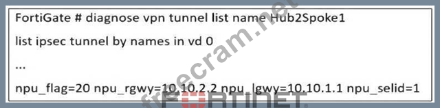 The diagnose vpn tunnel list name Hub2Spoke1 command output provides key information about the offloading status of an IPsec VPN tunnel to the Network Processing Unit (NPU). npu_flag=20: This flag indicates that both inbound and outbound IPsec Security Associations (SAs) have been offloaded to the NPU, meaning the VPN traffic is processed in hardware instead of the CPU. npu_rgwy=10.10.2.2 and npu_lgwy=10.10.1.1: These IPs represent the remote gateway (rgwy) and local gateway (lgwy), confirming that the tunnel is successfully offloaded. npu_selid=1: This value means the session selector for the NPU offloaded SA is active. Since both inbound and outbound SAs are offloaded, the administrator can conclude that the FortiGate NPU is handling IPsec encryption and decryption efficiently, reducing CPU load and improving VPN performance.